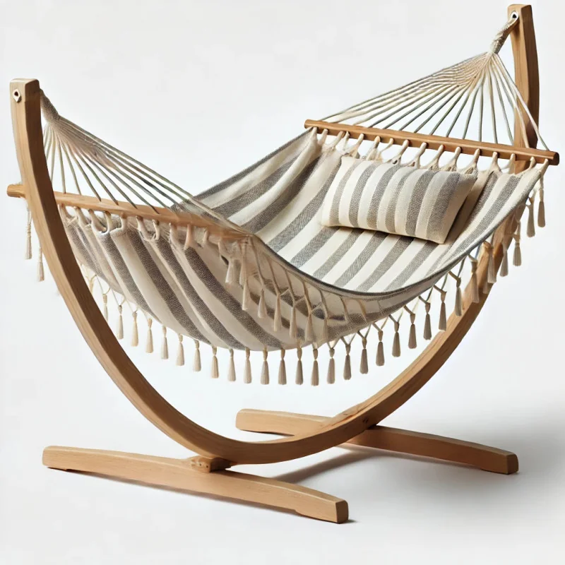 A comfortable garden hammock made from cotton fabric with a sturdy wooden frame. Perfect for relaxation in the garden or on the terrace.