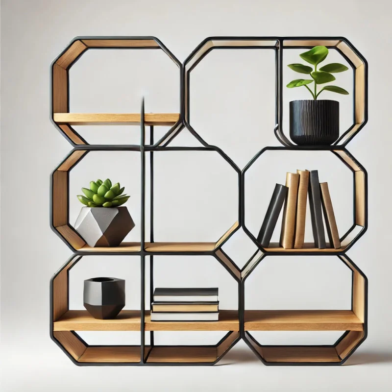 An elegant decorative shelf with a unique shape. The combination of wood and metal creates a harmonious piece, perfect for displaying books, plants, and decorations.